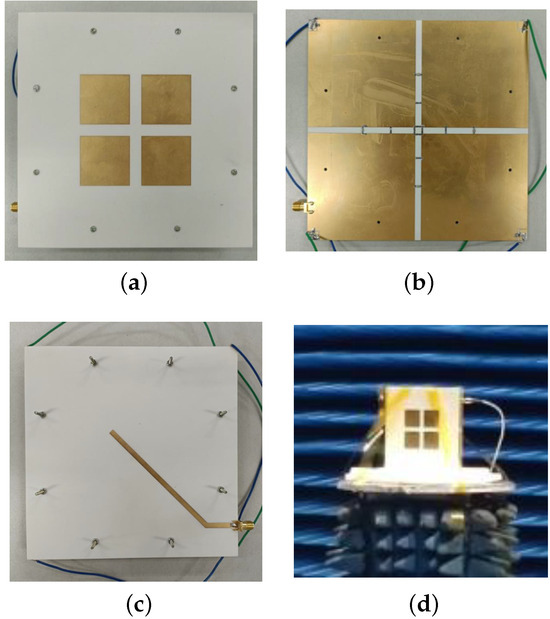The metal cavity improves the impedance matching of the antenna and promotes the fusion of the two resonance points. This metal cavity consists of four L-shaped aluminum blocks, which are also used for fixing the upper and lower dielectric substrates. The presence of the metal cavity allows enough space for the placement of the PIN diodes and capacitors. The four openings are designed to prevent the ground, which is divided into four pieces, from being electrically connected, meaning that the bias circuit can easily apply a voltage to the ends of the PIN diodes to make them conductive. In addition, the metal cavity binds the electromagnetic wave radiation, further improving the antenna’s gain.