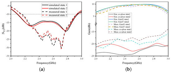 In the antenna impedance measurements, bias voltage was provided by a DC source. During the test, the current of the DC source was 0.04 A at 3 V, which proves that the four PIN diodes were all in normal operating condition. The simulated and measured |S11| of the proposed antenna are depicted in Figure 9a. The measurements show good agreement with the simulation results. It can be seen that the |S11| curves of the two states are highly overlapped due to the symmetrical structure of the antenna. Meanwhile, the proposed antenna exhibits dual-resonant behavior in the two resonant frequencies of 2.4 GHz and 2.8 GHz, which correspond to the / and T-/T- modes. By coupling these two neighboring resonant modes, the proposed antenna can achieve a wider −10 dB impedance bandwidth of 2.15–2.94 GHz (30.1%).