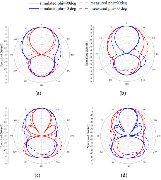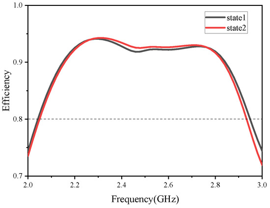 Figure 10 shows the normalized radiating patterns of the proposed antenna on the E- and H-planes at the two resonant frequencies in different states. The E-plane patterns at the two resonant frequencies are in agreement with the theory of analysis, as shown in Figure 3. Figure 9b reports the realized gain across the operating bandwidth of the antenna for the main polarization and cross-polarization. The curves are similar to the simulation results. The gain range of the proposed antenna is 6.5–9.5 dBi. In the simulation, the antenna has at least −19.5 dB cross polarization in both states and maintains −15 dB in measurement. Figure 11 demonstrates the efficiency of the antenna, which is higher than 80% in the operating band.