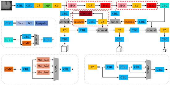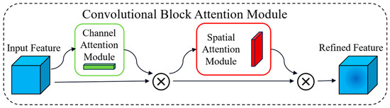 To enhance the model’s ability to pay attention to target information, the convolutional block attention modules are introduced after the two C5 modules in the backbone network, which improves the model’s ability to extract small targets and distinguish similar defects.