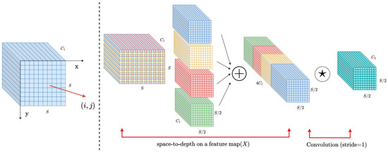 31]. This combination method can reduce the size of the feature map without losing information, retaining all the information in the channel, which greatly enhances the ability of the model to detect low-resolution images and small targets [