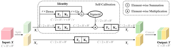 Conventional convolution has some limitations. Firstly, all of the convolution kernel learning modes of traditional convolution are similar; secondly, in the conventional convolution operation, the receptive field size of each spatial location is mainly determined by the predefined convolution kernel size, which can result in a lack of a large receptive field, thereby preventing the network from capturing sufficient high-level semantic information. Therefore, these two shortcomings may lead to low recognition of the features extracted by conventional convolution, subsequently affecting the accuracy of the model. To solve the above issues, this paper introduces self-calibrated convolutions (SCConv) [