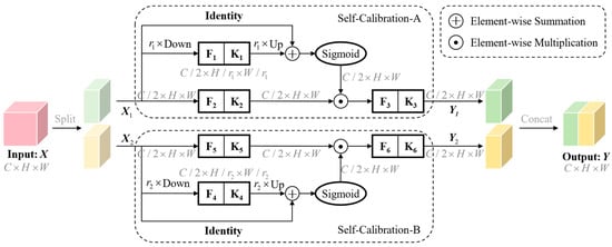 Some categories in the cigarette appearance defect dataset have small inter-class differences, and some appearance defects have unclear textures. This paper improves SCConv, with the expectation of further enhancing the module’s ability. The improved SCConv can adaptively construct correlations between long-distance spatial domains and channels and further expand the receptive field of each region in the network, thereby improving the feature expression ability and making the features more recognizable. The specific improvements are as follows: the part that retains the original spatial context is replaced by the self-calibration convolution block (Self-Calibration-B), and convolutions with three different convolution kernel sizes {K