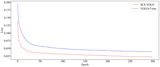 Figure 7 shows how the loss value changes with the number of iterations when SCS-YOLO and the original YOLOv7-tiny are trained on the same dataset under the same conditions. In