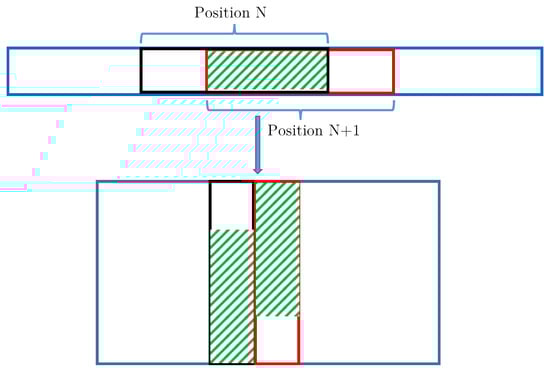 The schematic representation of how intra-row redundancy occurs. In the upper diagram, the black rectangle symbolizes the row kernel at position N, while the red rectangle represents the row kernel at position . The green stripe highlights the overlapping elements between these two positions. In the lower part, the green stripe illustrates the identical elements found in adjacent columns of the resulting matrix.