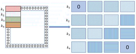 The schematic representation of inter-row redundancy. The kernel comprises four rows labeled to . The feature map is zero-padded with a size of one on all sides. This padding results in the top-left and bottom-right blocks of the matrix being zero matrices, as illustrated. The blocks along the skew diagonal are identical, highlighted by the same pattern to denote inter-row redundancy. It also exhibits intra-row redundancy within each block.
