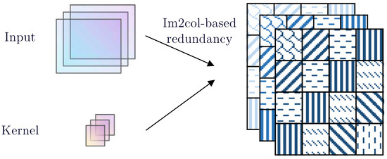 To formalize the im2col operation process, let us consider a feature map of size and a kernel of size . The feature map is zero-padded with size p, and the stride for the convolution is set to one. The im2col operation then reshapes this padded feature map into a matrix with dimensions , where each individual block in the resulting matrix has dimensions of . The mathematical definitions for intra-row and inter-row redundancy can be described as follows: