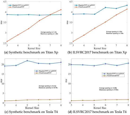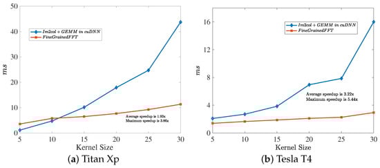 To rigorously assess the kernel-level performance of our proposed method, we directly measure pure GPU kernel execution times and compare them against the FFT-based and im2col+GEMM convolution implementations within cuDNN. This comparative analysis is conducted across varying kernel and batch sizes to comprehensively evaluate the strengths and weaknesses of each approach under different parameter settings. In our analysis, illustrated in Figure 11, we compare the FineGrained FFT algorithm with the Regular FFT algorithm using both a synthetic benchmark and the 2017 ILSVRC object localization benchmark on Nvidia Titan Xp and Tesla T4 GPUs, respectively. For the synthetic benchmark, we generate random input data and kernels sampled uniformly from the range . The results indicate that the execution time for the RegularFFT convolution remains relatively constant and unaffected by changes in kernel size. This stability is due to the method’s use of zero padding to match the kernel size to the feature map size, making the kernel size nearly irrelevant to its performance. Such consistency is maintained across different GPU architectures. Conversely, the performance of our proposed method declines as the kernel size increases, primarily due to its direct dependency on the kernel size, despite our approach not requiring full matrix unrolling. This trend is consistent in both Figure 11a,b. Given that our experimental measurements are obtained at approximately 4 milliseconds, we notice variations in the outcomes across various datasets. These variations fell within the reasonable fluctuation range, leading to an intersection in Figure 11a but not in Figure 11b. While the curves representing FineGrained FFT convolution in both Figure 11c,d appear visually straight, a closer look reveals that they have a small but non-zero slope. This indicates that the execution time actually grows with increasing kernel size, despite being seemingly constant. This behavior is due to the larger values of regular FFT, and FineGrained FFT seems small by comparison. It is worth noting in the cuDNN release notes that convolutions in cuDNN version 8.9.6, which is employed in Tesla T4, may experience performance regressions [55], resulting in larger gaps between curves in Figure 11c,d. Overall, our FineGrained FFT convolution consistently delivers high performance. In Figure 12, we compare the FineGrained FFT algorithm with the im2col+GEMM algorithm from cuDNN. As the kernel size increases from 5 to 30, the execution time for both algorithms rises; however, the im2col+GEMM algorithm exhibits a more pronounced increase. Our approach achieves higher performance primarily due to its strategy of not fully unrolling the feature maps. In contrast, the im2col+GEMM method requires a quadratic growth in unrolled matrix size with increasing kernel size. By avoiding a full unrolling of feature maps, our approach minimizes memory footprint, allowing it to achieve better performance.