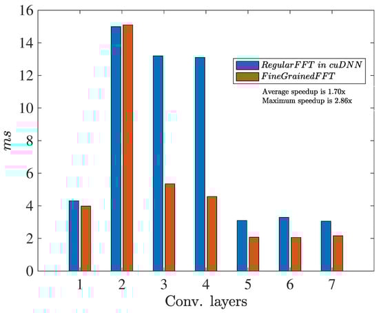 To understand the source of the performance improvement observed in VGG-16, we perform a detailed layer-wise comparison between our FineGrained FFT and Regular FFT implementation. This analysis focuses on the seven layers within VGG-16 that account for roughly of the overall execution time. The results, illustrated in Figure 14, demonstrate a layer-by-layer comparison. On average, FineGrained FFT outperforms Regular FFT by a factor of , with a maximum speedup of .