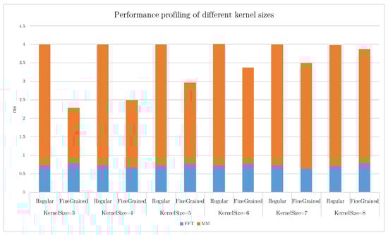 Profiling results for varying kernel sizes, illustrating the breakdown of execution time into FFT (Fast Fourier Transform) and MM (Matrix Multiplication).