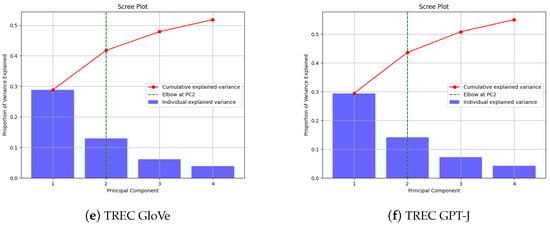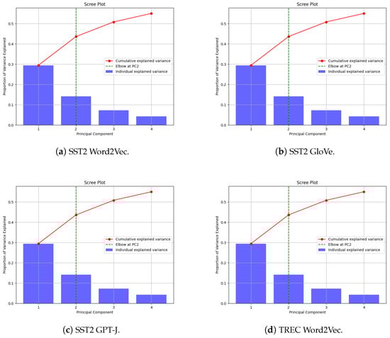 When applying PCA for dimensionality reduction in word embeddings, choosing the number of principal components (k) is crucial. This decision impacts the balance between information preservation and computational efficiency. While researchers often select k arbitrarily [,], the optimal value theoretically depends on the data’s intrinsic dimensionality []. Scree plots, which visualize the variance explained by each principal component, can guide this decision []. The ‘elbow point’ in these plots indicates where additional components offer diminishing returns []. Our scree plots for SST2 and TREC datasets (Figure 1) show consistent patterns across augmentation techniques. The first two principal components (PC1 and PC2) account for 42–44% of total variance, with PC1 alone explaining about 30%. A clear elbow point at PC2 is evident in all plots. Based on this analysis, we justify using PCA = 2 in our experiments. This choice strikes a balance between dimensionality reduction and information retention. While PCA = 3 or PCA = 4 would capture more variance, the gains are marginal compared to the increased computational cost. PC3 and PC4 individually contribute less than 10% to the explained variance, whereas PC1 and PC2 together explain 42–44%. The elbow point at PC2 marks a clear transition where the rate of variance explained by each additional component begins to level off. This diminishing return in variance explanation beyond PC2 supports our decision to set PCA = 2. Including more components would incrementally increase the total variance explained, but at the cost of higher dimensionality and increased computational complexity, potentially compromising the efficiency gains of dimensionality reduction. This approach significantly reduces computational complexity while preserving key features of the original embeddings. The consistency across datasets and augmentation methods suggests that PCA = 2 offers a robust, efficient dimensionality reduction strategy for various NLP tasks, balancing information preservation with computational efficiency.