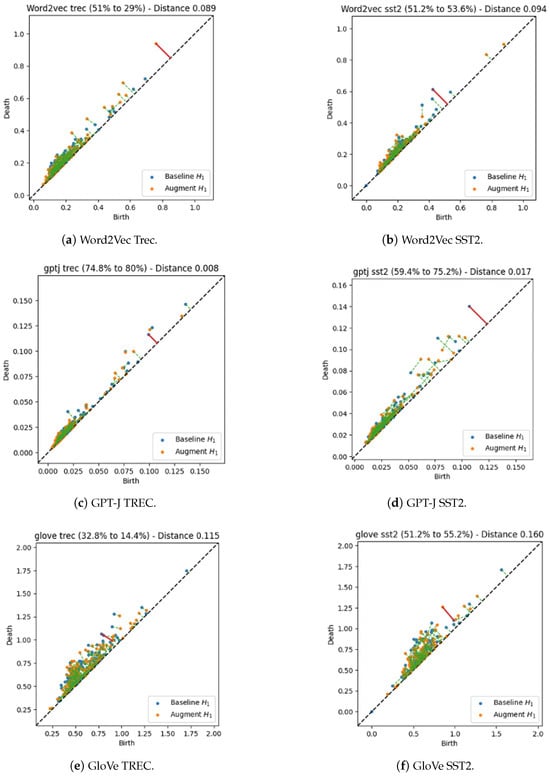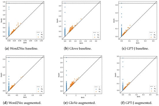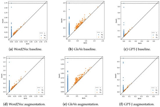 TDA is a field that has emerged from applied (algebraic) topology and computational geometry. It is motivated by the idea that topology and geometry can provide more insights and information about the structure of data; this is performed by computing abstract “shapes” of datasets []. There has been recent research into the use of TDA for NLP. In fact, there have also been some uses of topology in explaining various LLMs and deep learning phenomenons [,]. Thus, we have chosen to use TDA in looking at the underlying structure of DA techniques.