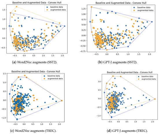 Previous attempts to apply convex hull analysis to text data encountered challenges due to the computational complexity []. This is because word embeddings are extremely high-dimensional vectors, with typical dimensions of 300. One way to overcome this problem is to perform dimensionality reduction. This can be achieved by using principal component analysis (PCA), which ensures that the most important patterns and variances in the data are captured. Studies have shown that PCA preserves the essential semantic relationships between words [], especially for text classification [].