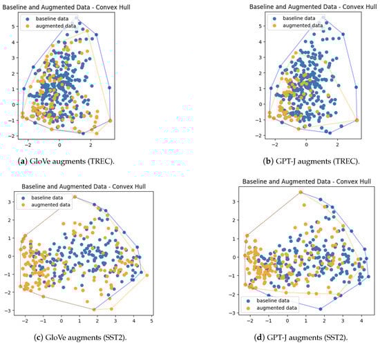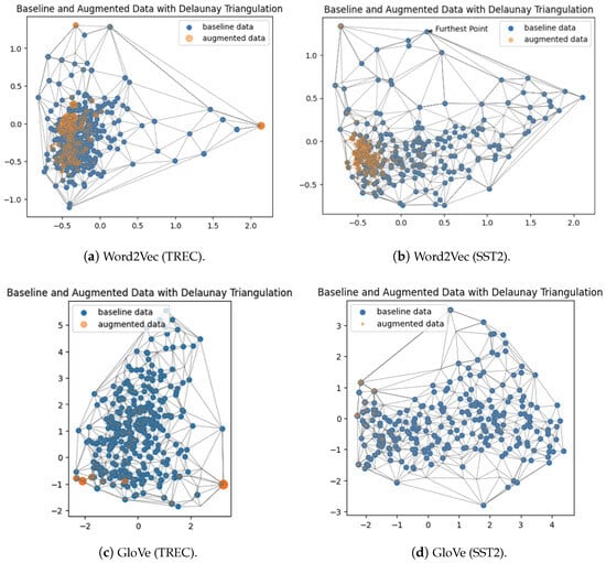 Delaunay triangulation connects a set of points by forming triangles in such a way that no point is inside the circumcircle of any triangle []. In our study, we directly applied Delaunay triangulation in the word embedding space of the data points. This technique allows us to quantify the connectivity and relationships between data points, providing additional insights into the structure of our augmented datasets.