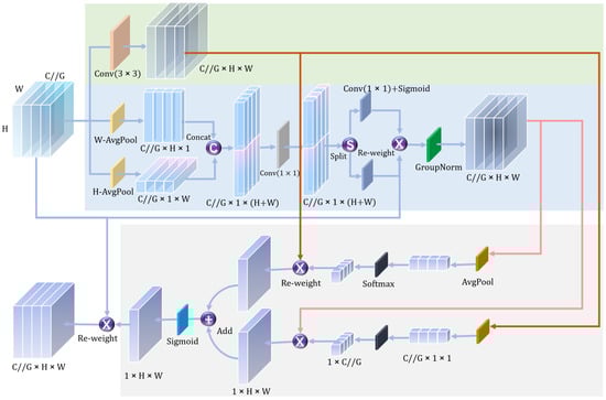 For the grouped features, the EMA mechanism employs a parallel sub-architecture, leveraging both 1 × 1 convolution kernels and 3 × 3 convolution kernels for feature extraction. Specifically, within the 1 × 1 convolution branch, inspired by the handling in CA (Coordinate Attention) [], average pooling is introduced to encode features along both the height and width dimensions, resulting in direction-aware feature maps in these two orientations. Subsequently, these feature maps undergo a concatenation operation followed by a convolution step, aiming to achieve cross-directional attention–perception interactions.
