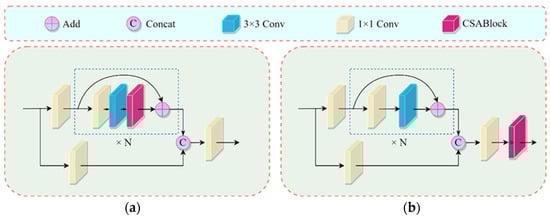 In this study, we compared the more widely employed attention modules, such as SE, CBAM, ECA, [], etc., and the effect on the networks when using the two insertion methods is indicated in Figure 4. The results are shown in Table 3. From this, it can be seen that the mAP@0.5 was generally higher than the (b) method when we chose the (a) insertion method. When the attention mechanism was added to the residual block, since the residual block itself has a shortcut connection, the original input information could be transferred directly to the later layers. This can be tremendously helpful in protecting information integrity, so that the weights learned by the attention mechanism can act on the original input feature map, which is more conductive to the expression of essential feature information. When the attention is added in the last layer, the weights act on the feature information that has been extracted by the C3 module, but a loss of information is inevitable during the feature extraction process. Therefore, method (a) is more effective in this respect. As a result of the additional time required for module computations in the residual structure, (b) method requires less inference time than (a) method.