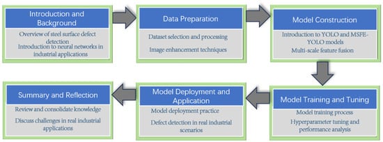 To effectively teach students how to apply neural networks for steel surface defect detection, we have adopted a comprehensive and structured learning approach, as illustrated in Figure 5. First, in the introduction and background knowledge phase, we introduce the significance of steel surface defect detection and its industrial applications. This phase helps students understand the real-world relevance of the technology and provides them with a solid theoretical foundation. Next, students proceed to the data preparation phase, where they learn how to select and process publicly available datasets and apply image enhancement techniques. This process not only enhances students’ data processing skills but also improves the model’s adaptability to unknown or complex scenarios. In the model development phase, students gain a thorough understanding of the YOLO series models, with a particular focus on the customized MSFE-YOLO model. This phase emphasizes how the Multi-Scale Feature Fusion (MSFE) mechanism improves detection accuracy, helping students understand the architecture and functionality of the model, appreciate its performance in practical applications, and develop their innovative capabilities. Subsequently, students participate in hands-on activities related to model training and tuning. By analyzing the detection results to optimize model performance and ensure accuracy in complex backgrounds, this phase develops students’ practical skills and problem-solving abilities. In the model deployment and application phase, students learn how to deploy the trained model in real-world scenarios, detect surface defects in steel materials in real-time, and analyze detection accuracy and robustness. This phase enhances students’ practical operation skills and prepares them for applications in industrial environments.