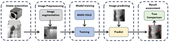 The overall framework for the experiment, which utilizes neural networks to detect surface defects in steel materials, is illustrated in Figure 6. In the data preparation phase, we leveraged the publicly available dataset of steel surface defects to their fullest extent. Subsequently, a series of image enhancement techniques, including but not limited to random rotation, non-uniform scaling and cropping, horizontal/vertical flipping, and the innovative mosaic tiling method, were implemented. These techniques effectively mitigated the issue of data scarcity while significantly enhancing the model’s adaptability to unknown or complex scenarios. Following this, we introduced the deeply customized and optimized MSFE-YOLO model, which, while inheriting the efficient detection characteristics of the YOLO series, incorporates a Multi-Scale Feature Extraction (MSFE) mechanism. This integration enables the model to capture nuanced texture variations and defect features on steel surfaces with greater precision. Through model training and parameter tuning, we constructed a defect detection model that is both swift and accurate. In the final stage of the experiment, the trained model was utilized to detect various types of defects on steel surfaces. The experimental results demonstrate that this model is not only capable of accurately identifying common defects such as cracks, rust, and scratches but also maintains stable detection performance against complex backgrounds. The generated detection outcomes closely align with actual conditions.