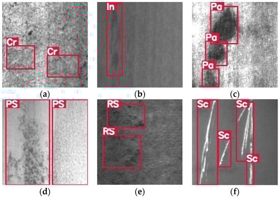 We used the public dataset NEU-DET [] for training and testing, which is a dataset specifically designed for the object detection of hot-rolled steel strip surface defects, provided by Northeastern University. As shown in Figure 7, it contains 1800 images consisting of six classes of defects with 300 images of 200 × 200 pixels for each class, including Crazing (Cr), Inclusion (In), Patches (Pas), Pitted Surface (PS), Rolled-in Scale (RS), and Scratches (Sc), where the GT box for each defect category is indicated by a red box. The training set and test set are divided according to the ratio of 8:2, with 1440 images and 360 images, respectively. To improve the generalization ability of the detection model, we performed image enhancement processing on the images before inputting them into the neural network, including contrast enhancement, image rotation and flipping, zooming and cropping, and mosaic enhancement.