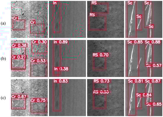 In order to verify the generalization of the improved model, this paper conducts experiments on the public datasets GC10-DET [], Severstal Steel [], and Crack500 [], respectively. The experimental results are shown in Table 5, and the evaluation standard uses mAP@0.5. Among them, GC10-DET is a steel surface defect dataset, with a total of 2306 images of 2048 × 1000 resolution, including 10 types of defects. Severstal Steel is a steel plate surface defect dataset, which is a Kaggle competition dataset. Its image resolution is 1600 × 256 and it contains four types of defects. This paper removes the non-defective images and uses 6666 images for training and testing. The Crack500 is a dataset about road cracks, with a total of 3000 images with 500 × 500 resolution, including only the crack defect.