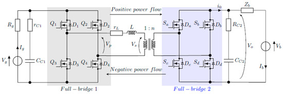 In the competitive world of bidirectional DC-DC converters for EV battery charging, the dual active bridge (DAB) stands out for its impressive blend of features. This topology boasts a high power density, thus managing significant power levels in a compact design [12]. Furthermore, the DAB converter utilizes soft switching, a technique that minimizes energy loss during operation and contributes to its exceptionally high efficiency. Additionally, the DAB offers galvanic isolation, a built-in safety feature that electrically separates the input and output sides, enhancing both safety and versatility. Finally, the DAB converter boasts voltage versatility, effortlessly handling a wide range of voltage levels on both the input and output. Figure 1 shows the DAB converter circuit which is composed of two full-bridge converters, an isolating high-frequency transformer, and an energy storage inductor which could be an external inductor or the lumped leakage inductor of the transformer [13].