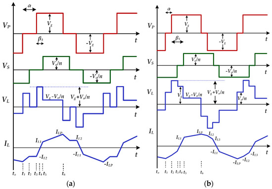 Waveforms of DAB operating with DPS in different buck modes: (a) 0 < β3 < α < 1; (b) 0 < α < β3 < 1.