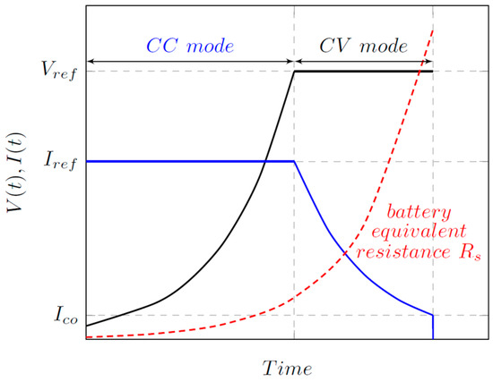 The constant current-constant voltage (CC-CV) method shown in Figure 4 is the most commonly used technique for charging batteries. In the initial phase, a constant current is applied, causing the battery terminal voltage to steadily increase until it reaches a threshold/reference value. Once this threshold is reached, the charging transitions to the final phase, which involves constant voltage charging. During this phase, the battery current gradually decreases, and charging stops when the current drops to about one-tenth of the reference current or when a specific C-rating (typically between 0.05 C and 0.1 C) is achieved [45]. Throughout the charging process, the battery’s equivalent resistance varies significantly, presenting a considerable challenge in control system design [46]. The first phase enables faster charging, while the second phase protects the battery from overvoltage.