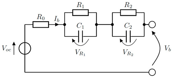 To conduct power electronic simulations involving batteries, it is essential to model them electrically. Researchers have proposed various electrical equivalent circuit models for batteries [47], but for this work, the second-order Thevenin equivalent model shown in Figure 5 was selected. This model was chosen due to its simplicity and sufficiently accurate computational results. It does not account for the battery’s self-discharge effect. The battery’s open circuit voltage, resistances, and capacitances depend on the state of charge (SoC) and temperature; however, this work ignores the temperature’s effect on these parameters.