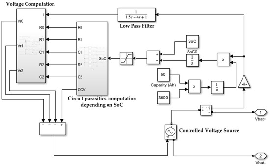 The resistance and capacitance values are derived experimentally at different SoCs and used to build a look-up table in MATLAB/Simulink from which the Thevenin equivalent model is then constructed using (3)–(6) as shown in Figure 6.