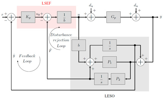 LADRC is based on the effective estimation and compensation of internal and external disturbances [49]. It contains a linear state error feedback (LSEF) control law, and a linear extended state observer (LESO) as shown in Figure 7. Moreover, it is made up of two main control loops: the inner loop, also called the disturbance rejection loop, and the outer loop, also called the feedback control loop. The total disturbances of the system are estimated in advance by the LESO and eliminated by the inner loop, which is combined with the feedback control loop to improve the transient and stability performance of the system [50].