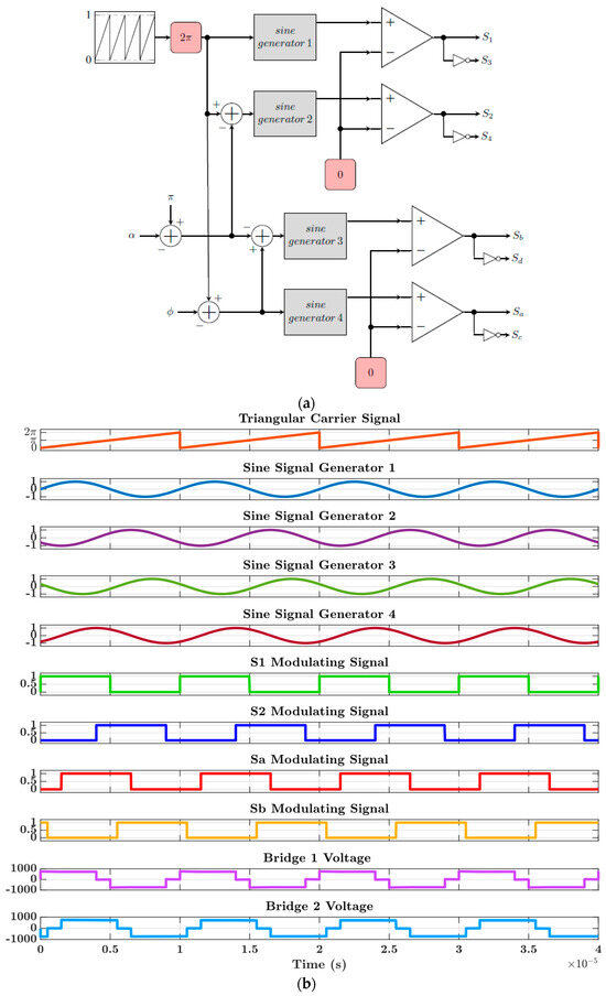 The three-level DPS modulator is shown in Figure 9a. It consists of a triangular carrier generator which produces a triangular signal from 0 to 2π. This phase signal is phase-shifted with both the internal and external phase angles and then passed through a sinusoidal signal generator to generate a signal between −1 and 1. This signal is then sent to a comparator to generate the respective PWM signals of each full-bridge pair having a fixed duty ratio of 50%. Figure 9b shows an example implementation when α = 0.1π and ϕ = 0.3π. We observe the sinusoidally generated signals phase-shifted from each other and sent to their respective comparators to generate phase-shifted modulating signals for each full bridge. The overall effect is the production of a three-level square wave voltage profile at both ends of each full bridge as observed in the figure.