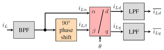 After extracting the fundamental component of the inductor current, an orthogonal current signal is generated by applying a phase shift to it. Then a stationary frame (αβ) to synchronous rotating frame (dq) coordinate transformation (Park transform) is performed to generate the active and reactive components of inductor current, permitting the decoupled and independent control of the DAB active and reactive power. This transformation is given by (21) [55,56]: