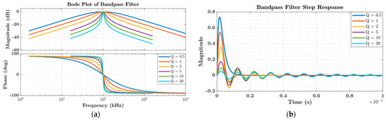 The frequency responses of the BPF for Q = 0.5, 1, 2, 5, 10, and 20 are shown in Figure 11a. We observe that the higher the value of Q, the better the pass-wave performance of the BPF (higher selectivity), but the allowable frequency range is reduced. Furthermore, Figure 11b shows the unit step responses of the BPF for Q = 0.5, 1, 2, 5, 10, and 20. We see that as Q increases, the initial system overshoot reduces while the attenuation time and oscillations increase, which influences the dynamic performance of the DAB converter when the load changes suddenly. Considering all that has been said before, Q = 5 has been selected as a compromise between better system dynamic performance and signal attenuation capabilities of the BPF.