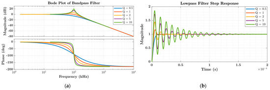 The LPF frequency responses for Q = 0.5, 1, 2, 5, and 10 are shown in Figure 12a. We observe that the higher the Q value, the higher the resonant peak. Moreover, the unit step responses of the LPF for Q = 0.5, 1, 2, 5, and 10 are shown in Figure 12b. It is observable that as Q increases, the system oscillations, overshoots, and response time all increase, hampering the dynamic performance of the DAB converter, especially in the presence of system disturbances. Therefore, Q = 1 has been selected as a compromise between better system dynamic performance and signal attenuation capabilities of the LPF.