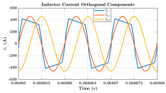 The battery charging is performed by first charging the battery at a constant current of 270 A, then at a constant voltage of 900 V. Figure 14 shows the DAB inductor current with its decoupled alpha and beta components during the second charging period, with the beta component phase-shifted by 90° from its alpha counterpart as expected.