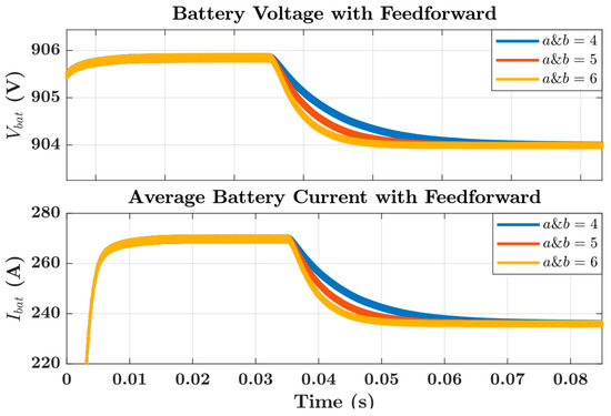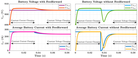 Figure 15 shows the actual and reference battery voltage and average battery current during each charging mode with and without the proposed droop-based feedforward technique. In both cases, the battery is first charged at a constant current of 270 A, during which the voltage is not being controlled. Afterwards, at t = 0.035 s, the charging switches to constant voltage, wherein the battery voltage starts being controlled at a value of 904 V. However, without the proposed feedforward technique, there is a large dip in both the battery current and voltage during the switch from CC to CV, lasting 20 ms. With the proposed technique, we observe a very smooth and seamless transition from CC to CV lasting 8 ms.