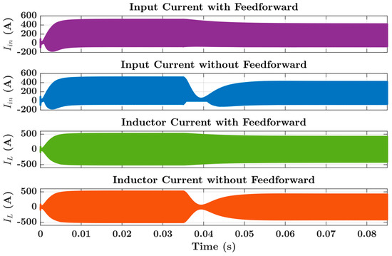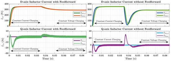 DQ-axis inductor current control with and without the proposed feedforward technique.