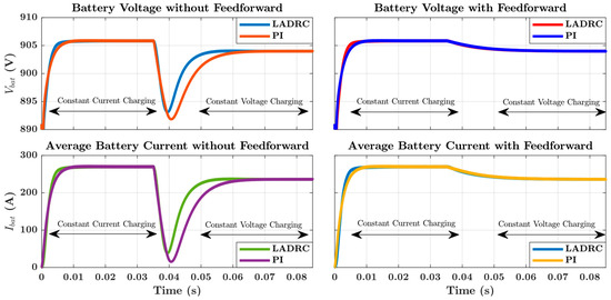 Finally, LADRC and the PI controller are compared, both designed with identical bandwidths, and the results obtained without and with the proposed feedforward technique are shown in Figure 19. Without feedforward, both PI and LADRC have a huge dip in battery current and voltage during the transition from CC to CV; however, the LADRC takes less time to transition to the CV mode and attain steady state as well as having lesser dips compared to PI. As can be seen, the introduction of the proposed feedforward control scheme eliminates the voltage and current dips during the mode transition for both the LADRC and PI controllers, with both controllers possessing similar transition times, thus demonstrating the robustness of the proposed feedforward scheme.