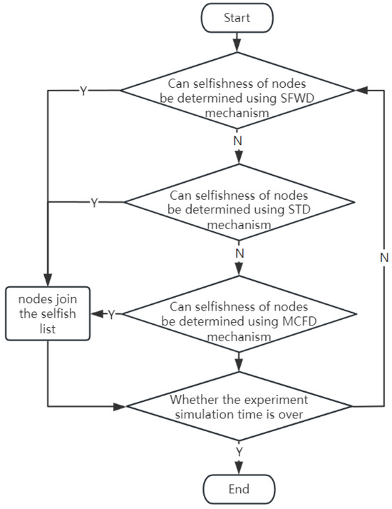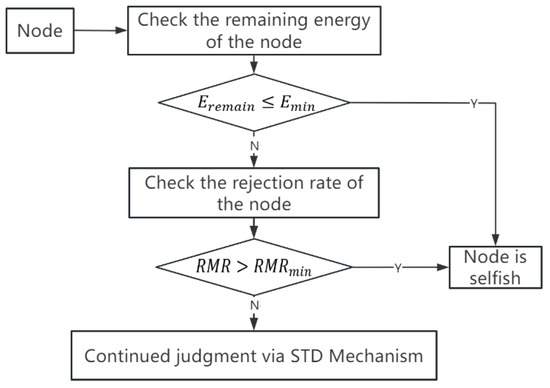 where denotes the sum of messages a node has declined, and signifies the aggregate number of requests for message forwarding that the node has encountered. In summary, the detailed detection steps of the node subjective forwarding intention detection mechanism are as follows: