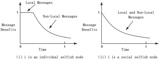 where represents message m’s individual benefit to node i, represents message m’s social benefit to node i, and represents the social consciousness level of node i and . When , it denotes that node i is individually selfish, while when , it indicates that the individual and social benefits of the message, m, to node i are equally important.