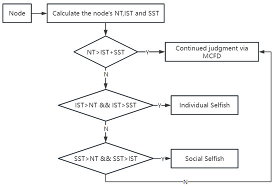 | Input: , , Output: Boolean value 1: if then 2: Apply the MCFD algorithm to judge 3: else if and then 4: Boolean value = YES and i is an individually selfish node 5: else if and then 6: Boolean value = YES and i is a socially selfish node 7: end if |