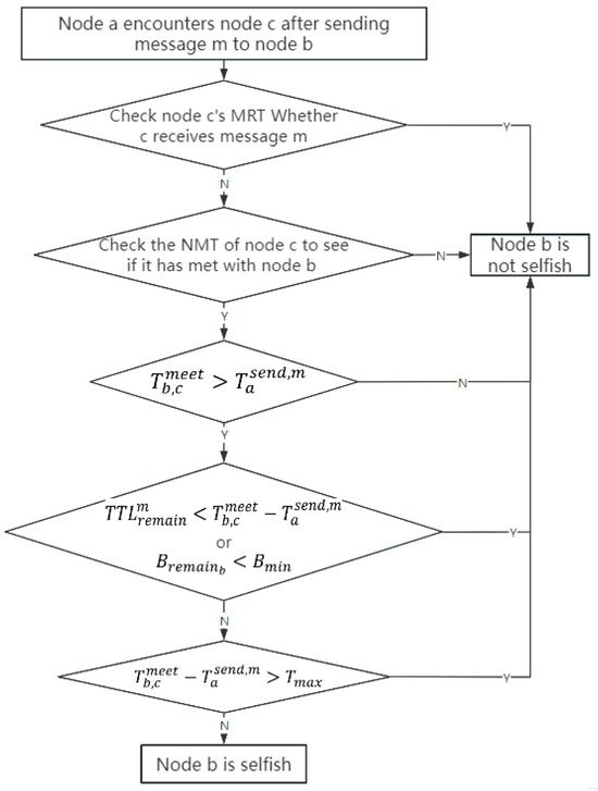 (2) If there is no confirmation that node C received message m forwarded from node B from the node’s message reception records table , then check the node meeting records table to see whether it met with node B. If an encounter does not occur, it suggests that node B did not come into contact with node C after receiving the message, m, and under these circumstances, it is not feasible to ascertain if node B exhibits selfish behavior. If an encounter did occur, this should be combined with node A’s message-sending records table, , to check if the encounter time between node B and node C is earlier than the time node A sent message m. If so, it indicates that node B and node C had an encounter, and node B did not receive m from node A; at this time, we cannot judge whether node B is selfish or not. If not, then we check at this time if m’s remaining survival time is less than the difference between node B and node C’s encounter , and the moment of node A sends the message , or we see if node B’s remaining cache space , which is less than the cache space required to forward the message of the minimum threshold , is valid. If it is valid, it indicates that—at this time—the message m has expired, or node B discards the message due to the temporary cache shortage. At this time, it is not possible to judge whether node B is selfish or not; if it is not valid, then the difference between the moment of encounter between node B and C and the moment node A sends message m is compared to the maximum time threshold . This comparison is used to check whether node B received m and then took a very long period before encountering node C. If this is the case, it indicates a high likelihood that node B could forward m to other nodes, and at this time, it is still not possible to confirm if node B is selfish. If not, it indicates that node B encounters node C very soon after receiving the message m, and there is less probability that it will forward m to others. It denotes that node B receives m but drops it, indicating that the node is selfish.