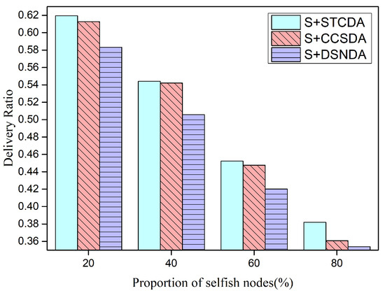 Comparison of the message delivery ratios of different percentages of selfish nodes.