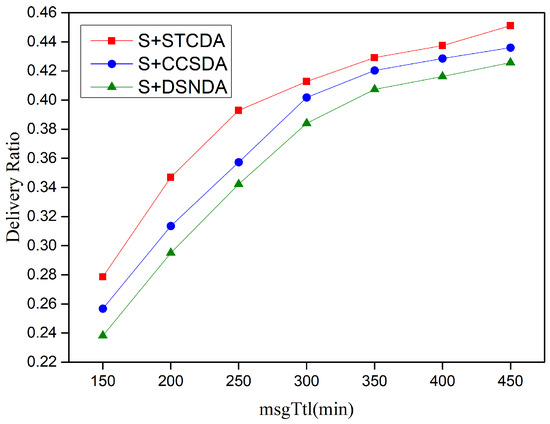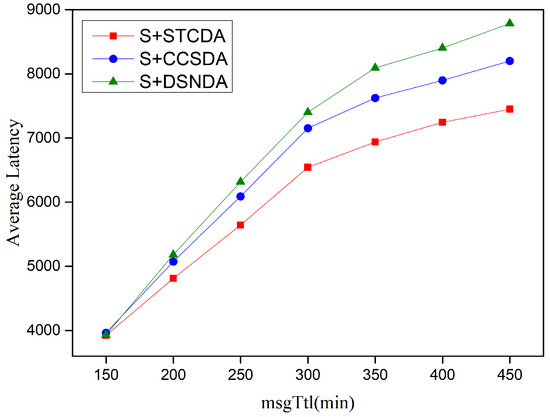 When changing the message survival time, the percentage of selfish nodes was set to 70%, and the message survival times were set to 150, 200, 250, 300, 350, and 400 min. Figure 9 and Figure 10 describe the performance comparisons of these schemes by examining the message delivery rate and average delay as the message survival time varies. From the results of the simulation experiments, it is evident that with an increase in message survival time, the STCDA algorithm outperforms the other two algorithms. It not only improves the message delivery rate but also reduces the average delay.