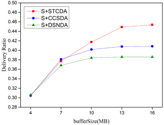 In the simulation experiments, the spray-and-wait routing algorithm was employed as the underlying network protocol. The STCDA algorithm was compared with the CCSDA algorithm from the literature [32] and the DSNDA algorithm [31] under varying proportions of selfish nodes, message survival times, and different message cache space sizes. Three simulation scenario schemes were designed as follows: