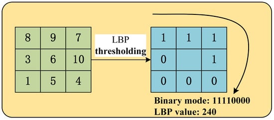 In the calculation, the eight neighborhoods with a size of 3 × 3 are selected first, and then the gray value of the center pixel and neighborhood pixels in each neighborhood is compared. The neighborhood location is assigned to 0 or 1 according to the thresholding function. Specifically, points larger than the value of the center pixel are assigned to 1, and points smaller than the center pixel are assigned to 0, and eight binary values are obtained. Then, the encoded value of the LBP operator is obtained according to certain coding rules. The thresholding diagram of the original LBP operator is shown in Figure 2.