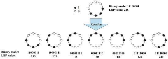 where represents the LBP feature of local rotation invariance and ROR(x,k) represents a cyclic shift to the right of the p-bit binary number x for k times (k < p). The specific implementation process is shown in Figure 3. In Figure 3, a total of eight LBP modes are shown, and the numbers below each operator represent the LBP value corresponding to the operator. After the rotation invariant treatment, the LBP value with rotation invariance is finally obtained as 15—that is, the rotation invariant LBP mode corresponding to the eight LBP modes is 00001111.