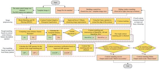 To solve the above problems, this paper presents an improved product defect detection method combining centroid distance and textural information. The technical flow chart is shown in Figure 1. On the basis of image preprocessing, the closed contour features are extracted by means of an improved fuzzy C-means clustering image segmentation method, and a robust coarse matched contour pair is obtained by using the contour center distance description operator for bidirectional matching. After the coarse matching contour pair is screened, the refined matching result is obtained by using the improved local binary pattern operator. Finally, by comparing whether the number of fine matching pairs is consistent with the number of template outlines, the detection of good and bad parts of industrial products is realized. The proposed product defect detection method combining centroid distance and textural information uses the contour center distance description operator and the improved local binary pattern operator as the salient features. This feature has the advantages of anti-rotation and anti-gray difference invariance, fast calculation, and no special requirements relating to the image.