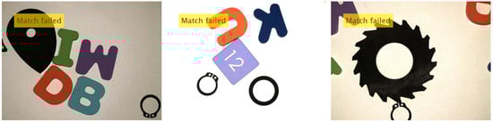 The brightness of the image has a great influence on the contour extraction results [37]. In the process of product matching, it is expected that the image of the same product can be correctly matched under different brightness levels. In order to test the anti-gray difference matching effect of the proposed algorithm, four groups of comparison experiments were designed. We randomly selected the E = 50/75/100/125/150 (lux) arbitrary image as a template image. Mild Gaussian noise with a mean of 0 and a variance of 0.01 was added to other light intensity images to generate image sets with different gray differences to be matched. By comparing the precision matching accuracy rate based on the improved LBP operator, the anti-gray difference ability of the algorithm was verified. The experimental results are shown in Table 3, in which the character model/digital model/ratchet with light intensity E = 50 lux is used as the template image, and mild Gaussian noise with a mean value of 0 and a variance of 0.01 is added to the images to be matched with other light intensity respectively. Based on improved LBP operator matching, the fine matching accuracy of the three groups was 100%, showing that the proposed method has good resistance to gray scale difference matching performance.