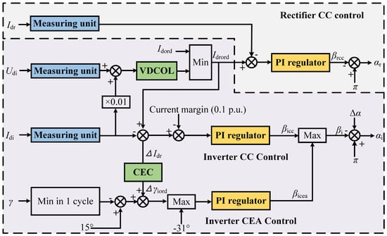 The studied LCC–HVDC system in this paper adopts the CIGRE Benchmark model [], in which the rectifier configures with constant current (CC) control and constant firing angle control, and the inverter configures with CC control, constant extinction angle (CEA) control, current error control (CEC), and voltage-dependent current order limiter (VDCOL). When the system operates in the normal state, the rectifier adopts CC control and the inverter adopts CEA control. Figure 1 shows the schematic diagram of the fundamental control. The nomenclature of the related variables is provided in Table 1.